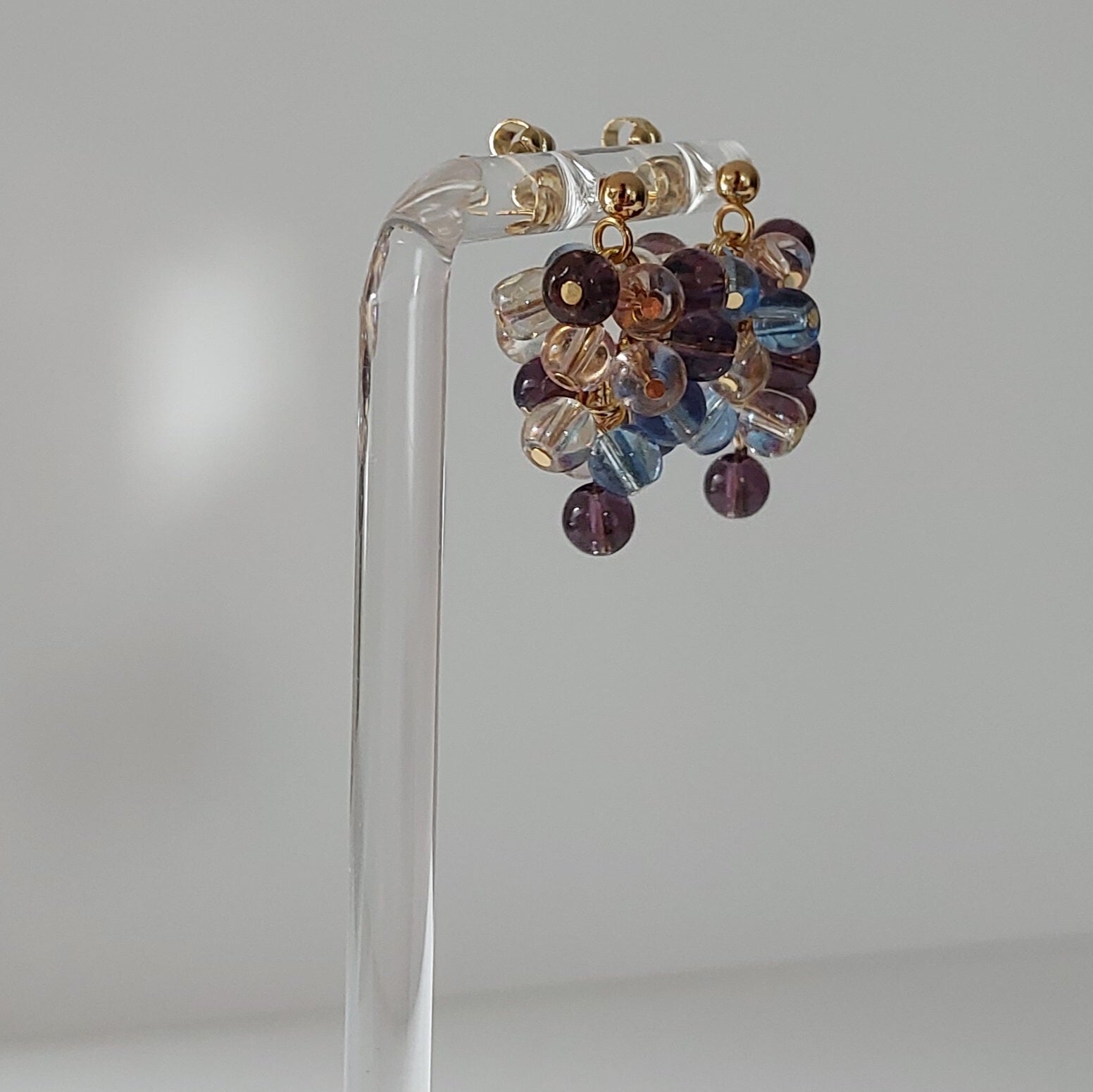 Näissä korvakoruissa säihkyy violetti ja sininen. Kullattuun tappikiinnitykseen on koottu pieniä, kevyesti hohtavia lasihelmiä, jotka taittavat valoa kauniisti jokaisella liikkeellä. Värimaailma loistaa kauniissa neljän värin yhdistelmässä – tehden korvakoruista täydellisen valinnan niin arjen piristykseksi kuin juhlahetkiin.