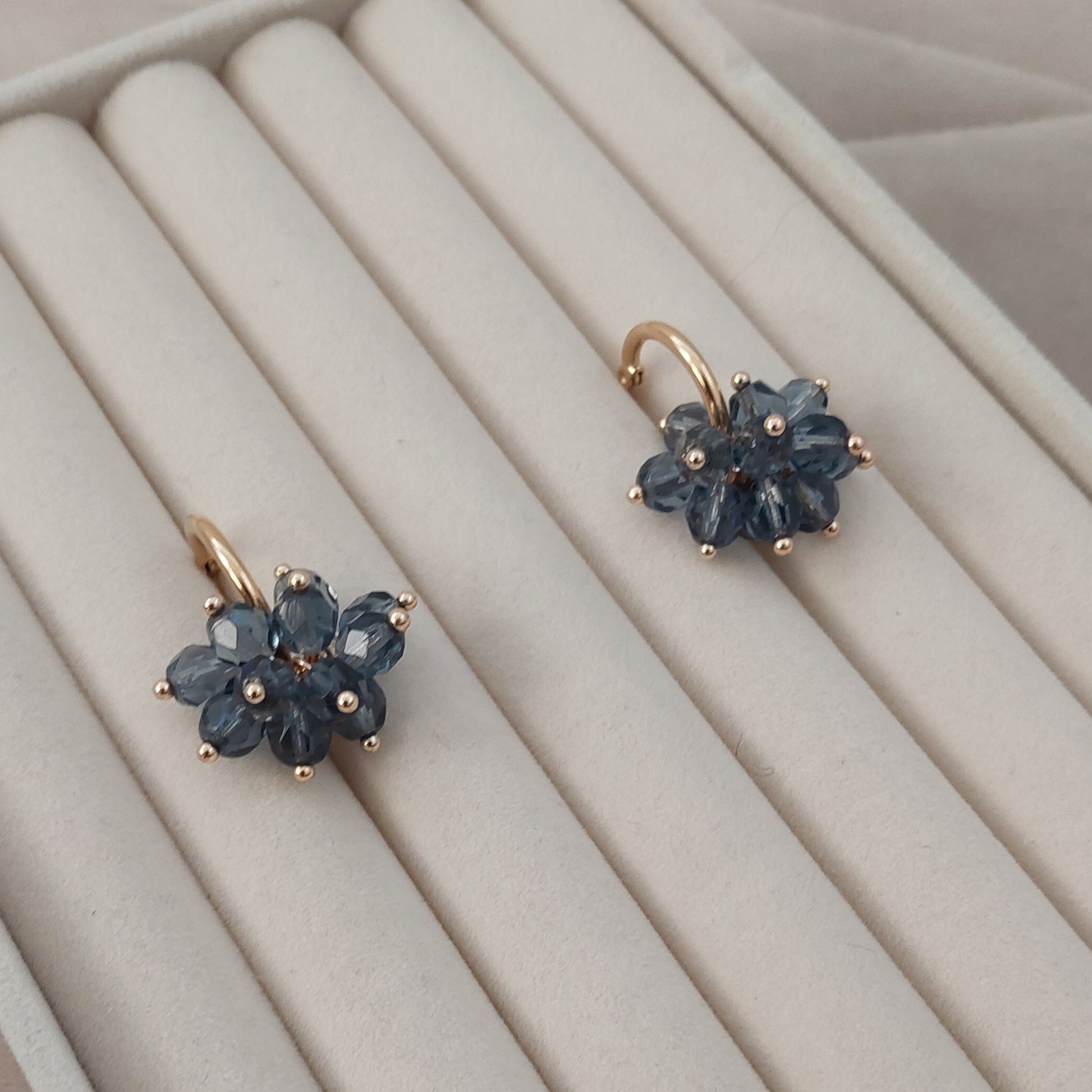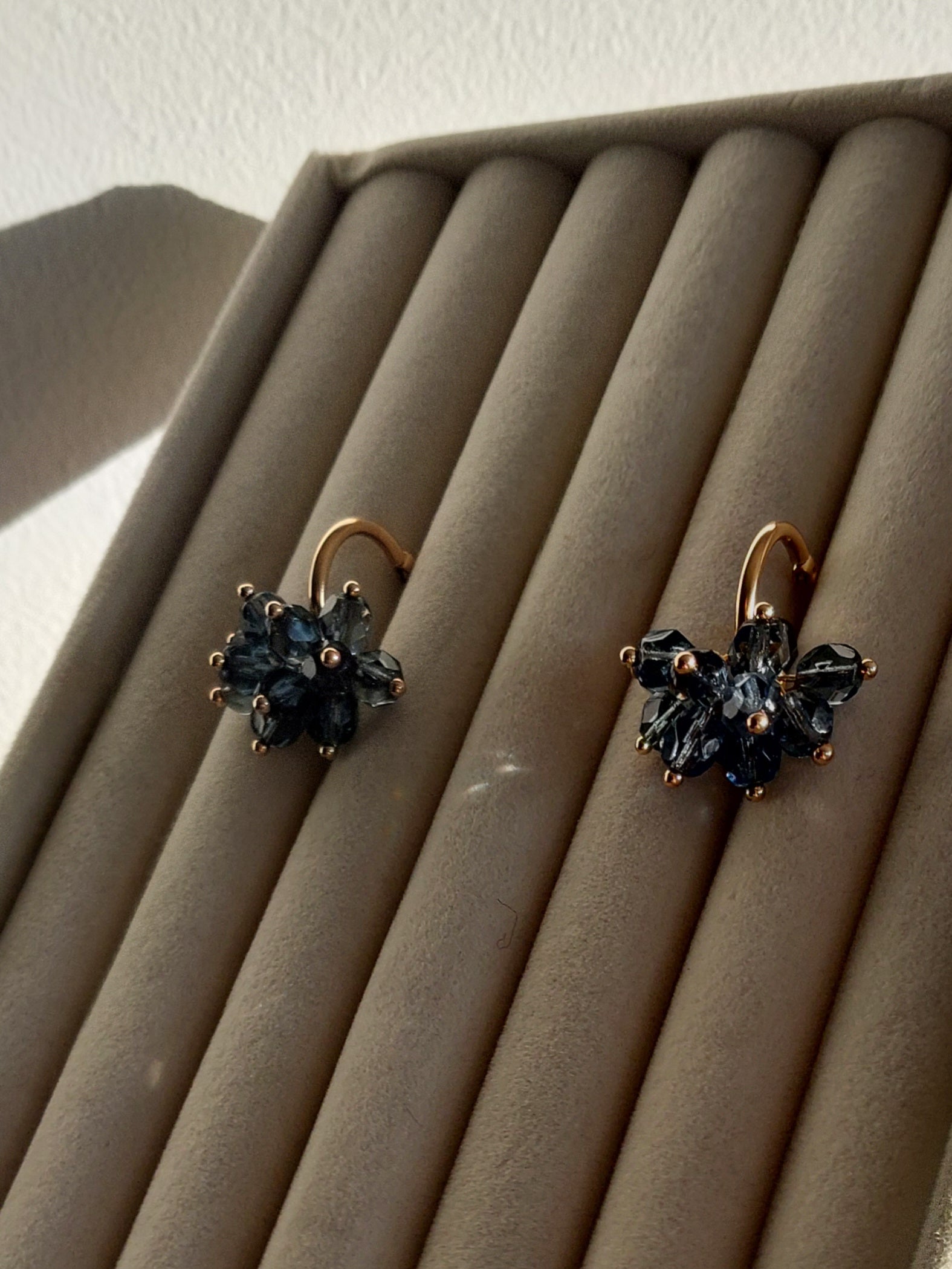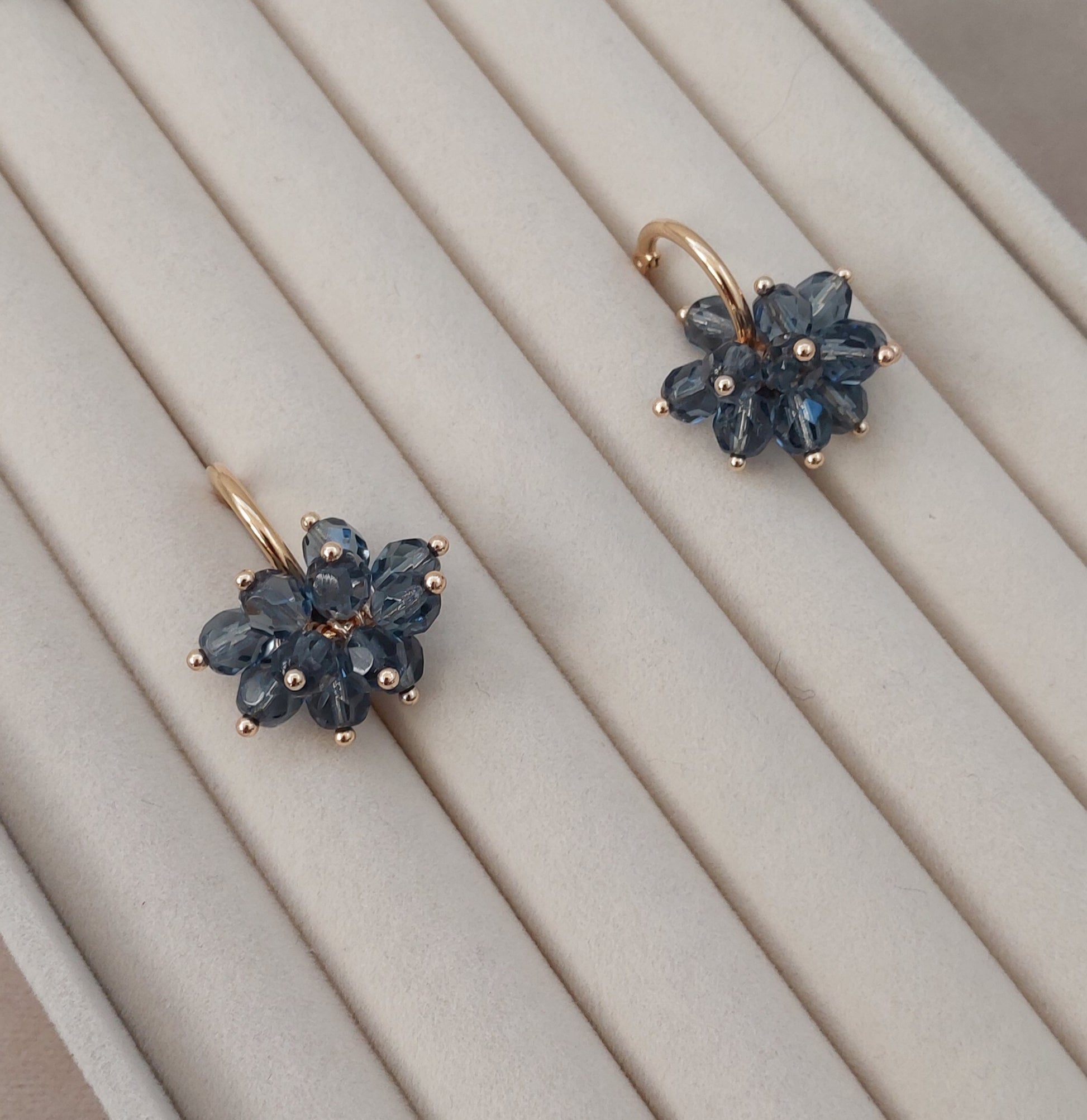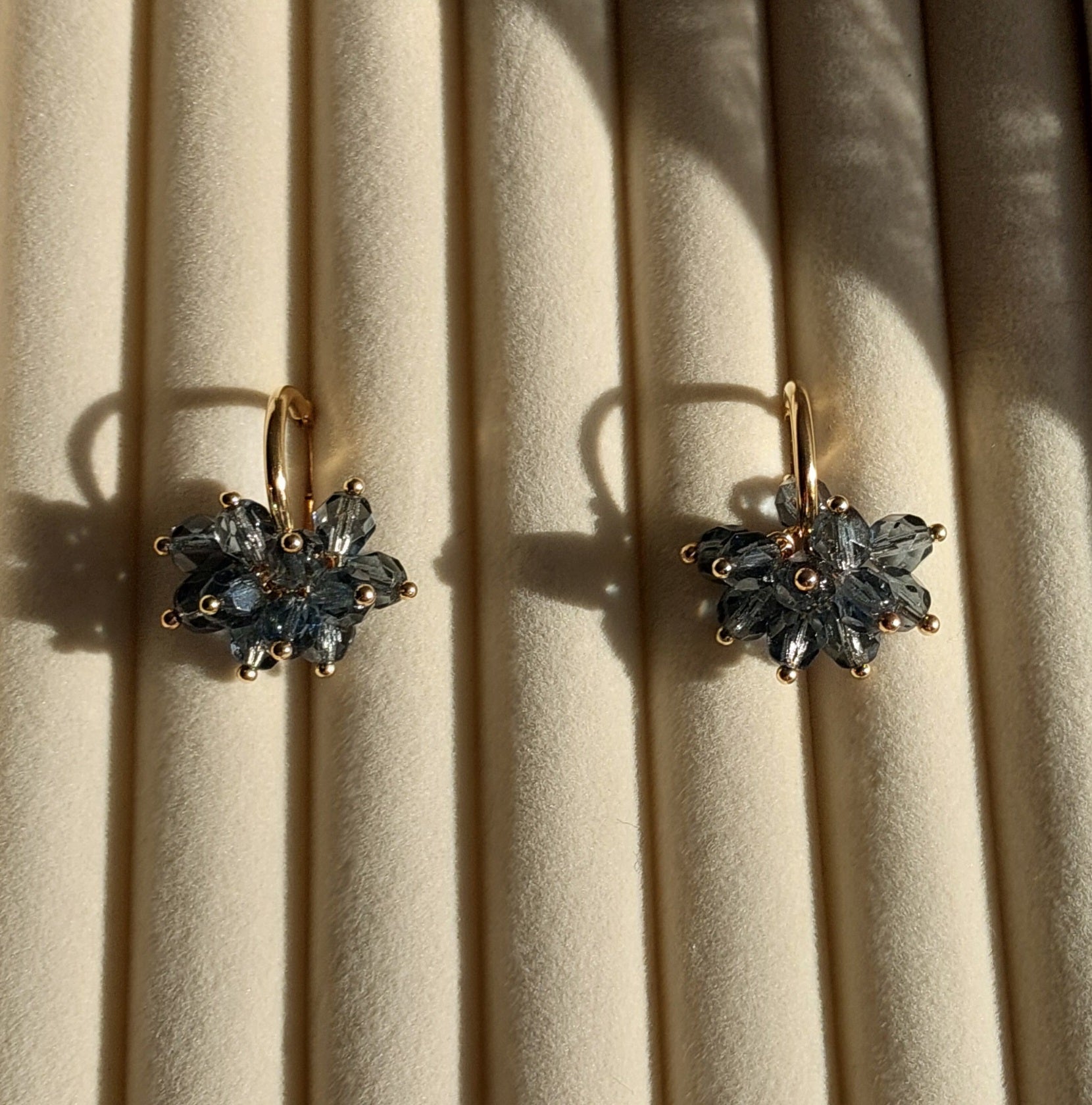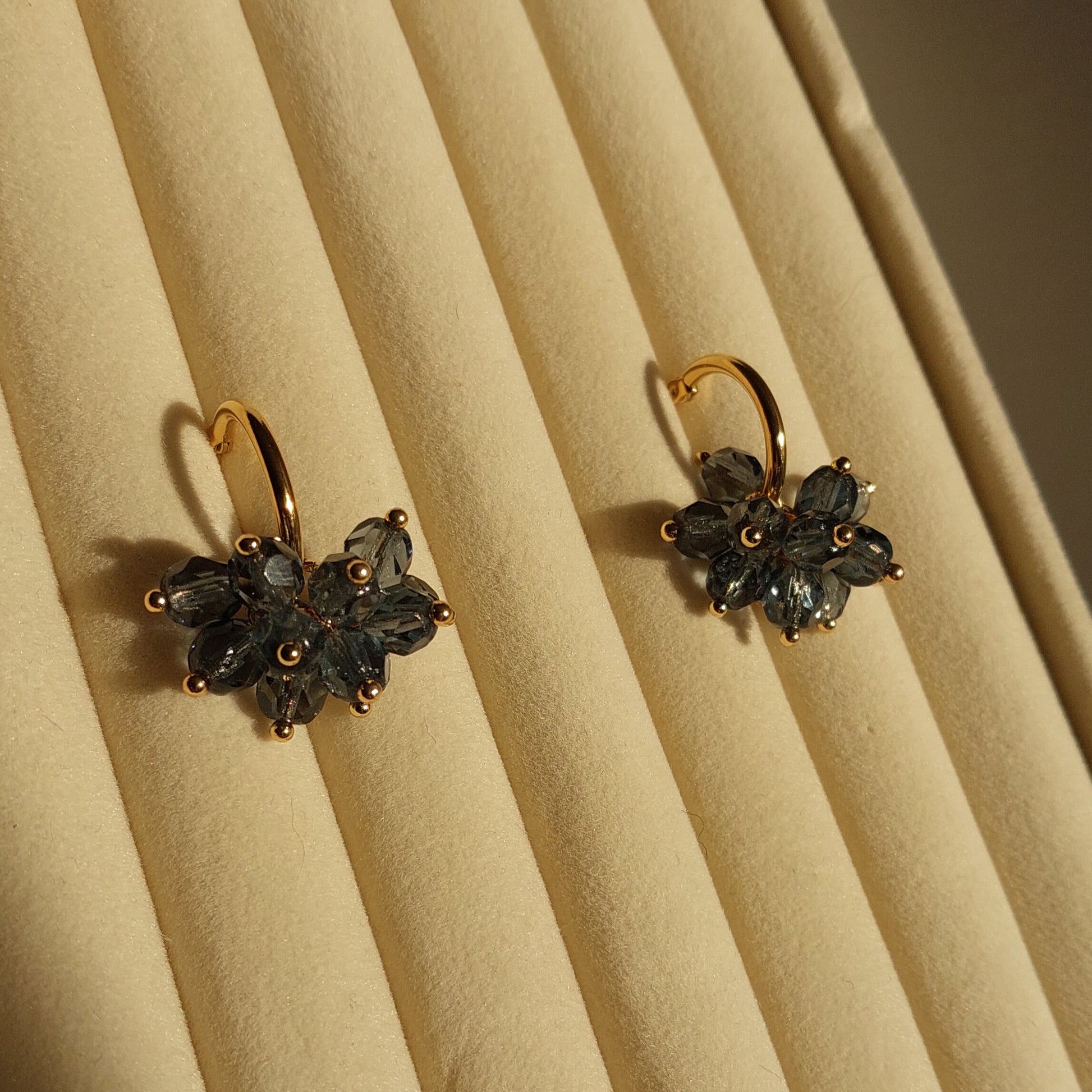 Lasihelmet ja ruostumattomasta teräksestä valmistetut, kullatut koruosat luovat ajattoman kokonaisuuden.