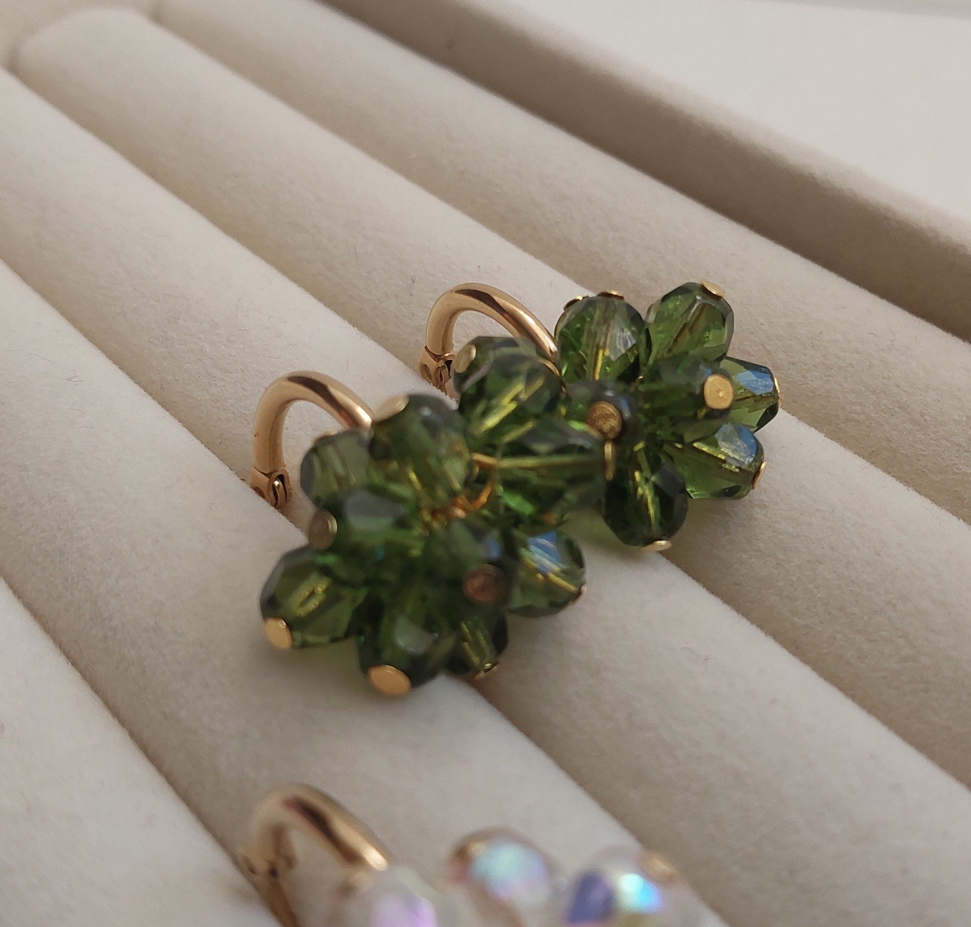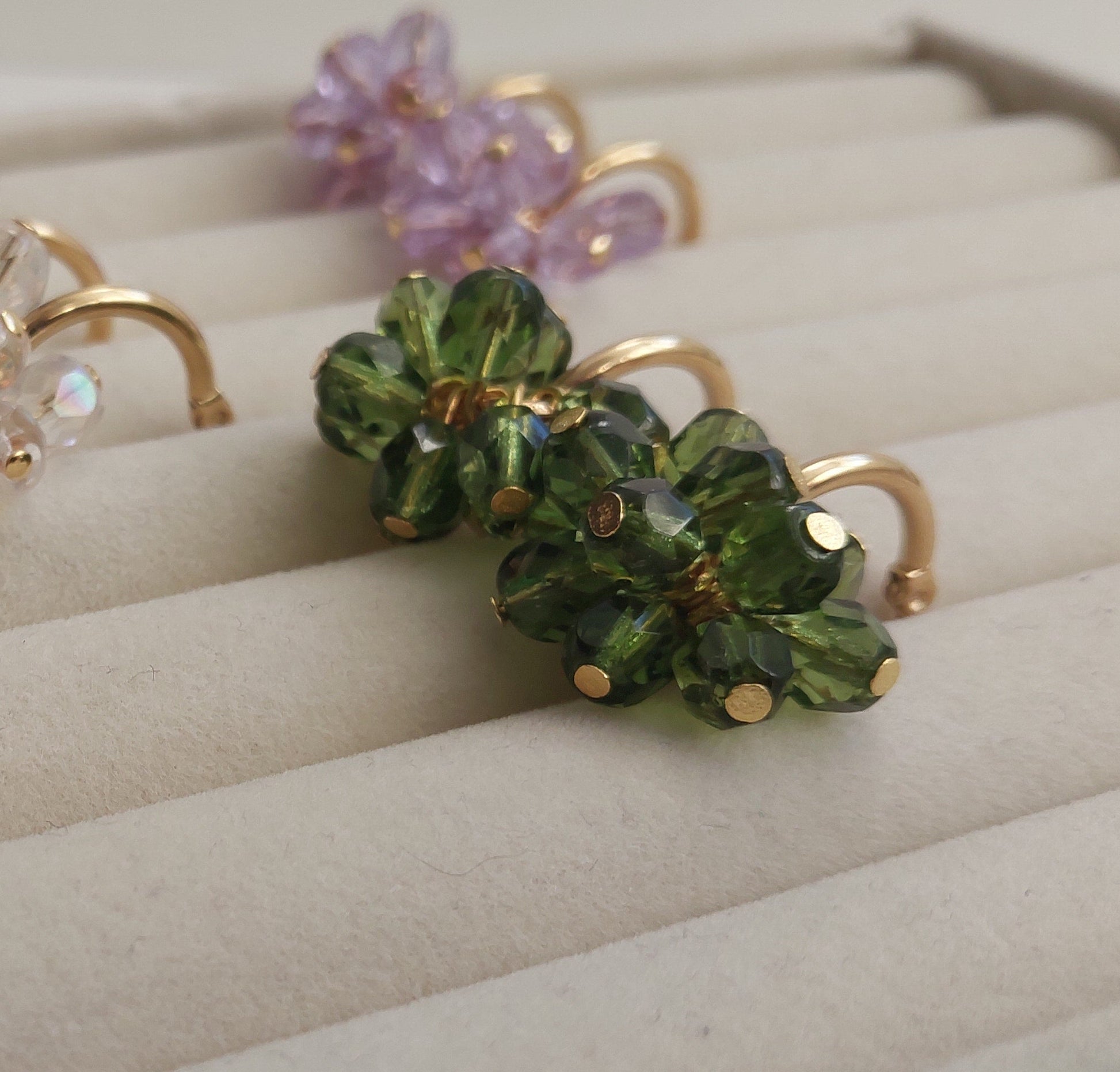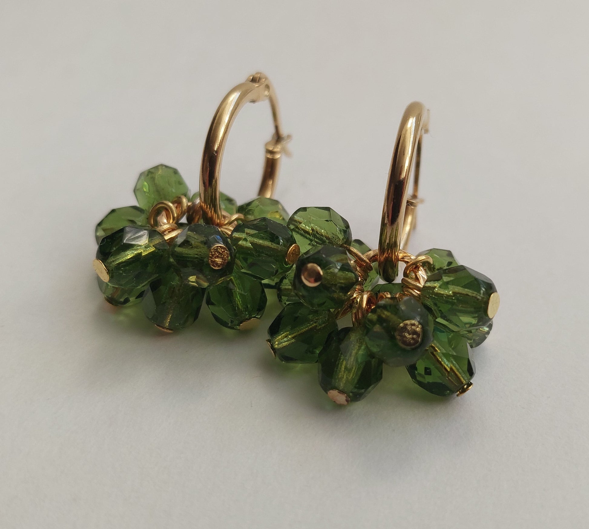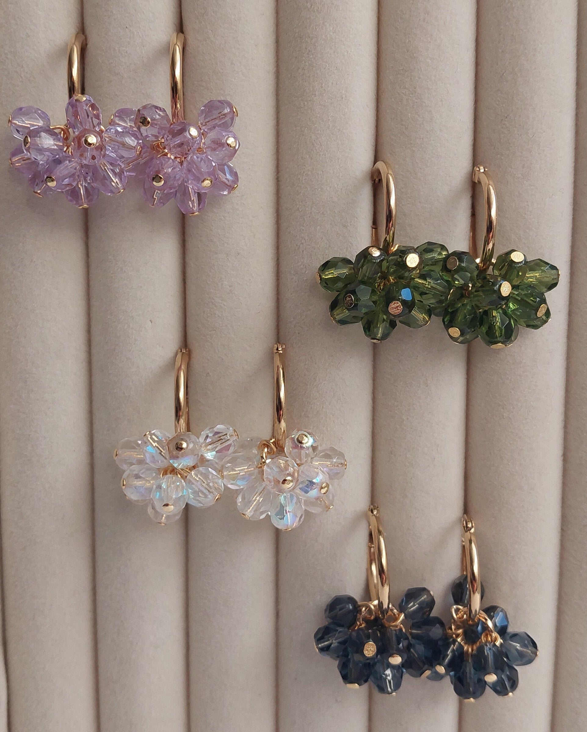 Lasihelmet ja ruostumattomasta teräksestä valmistetut, kullatut koruosat luovat ajattoman kokonaisuuden.