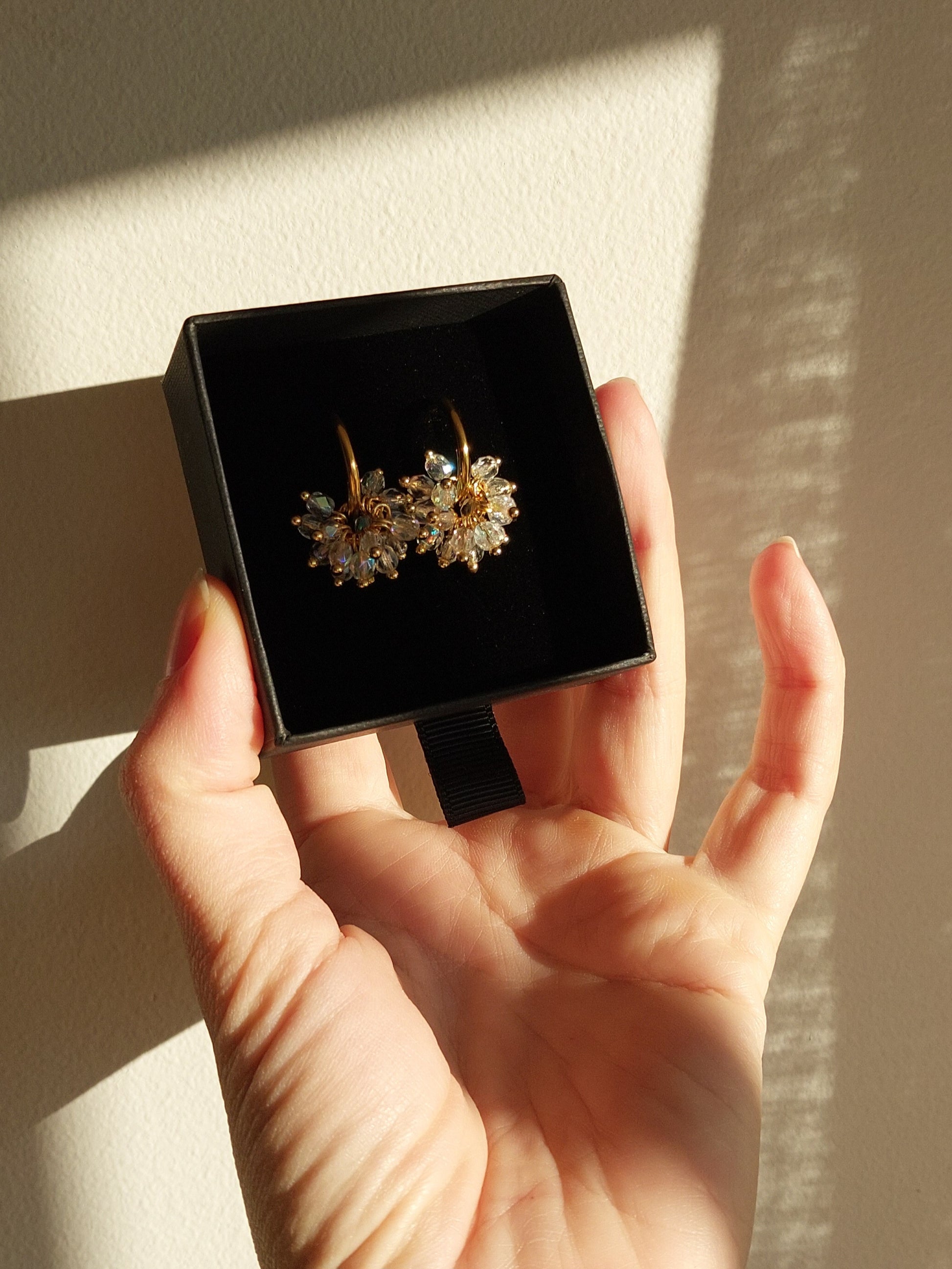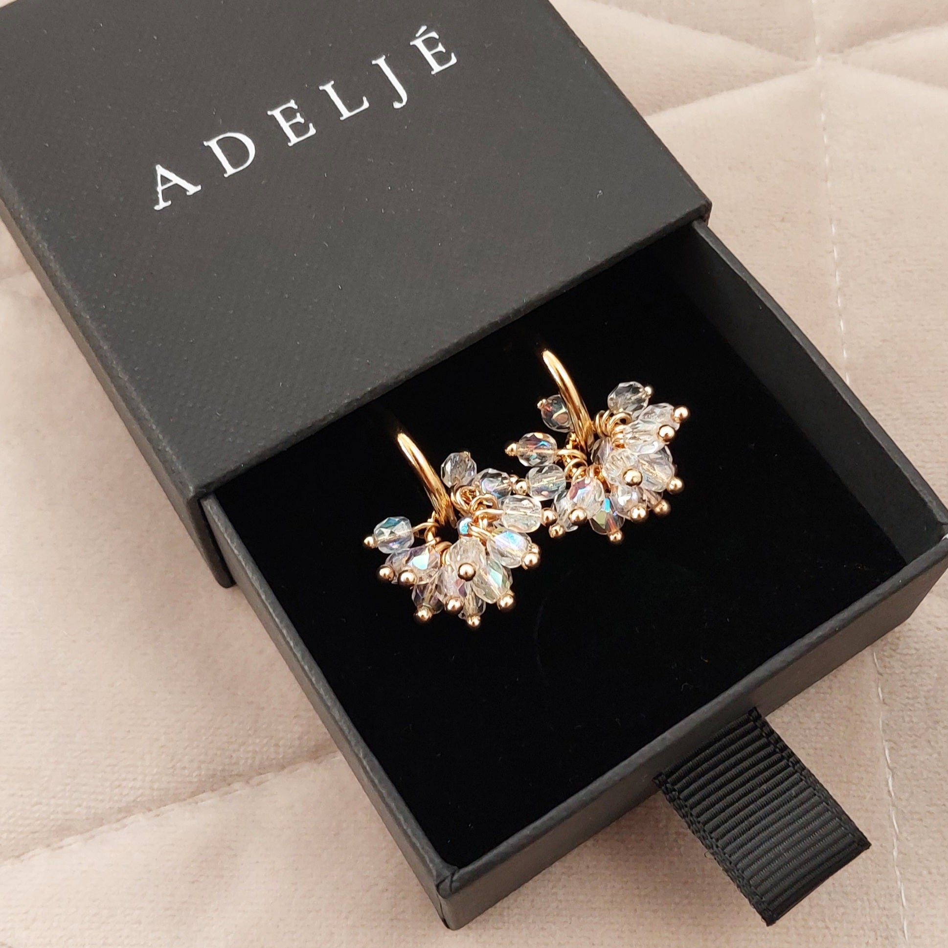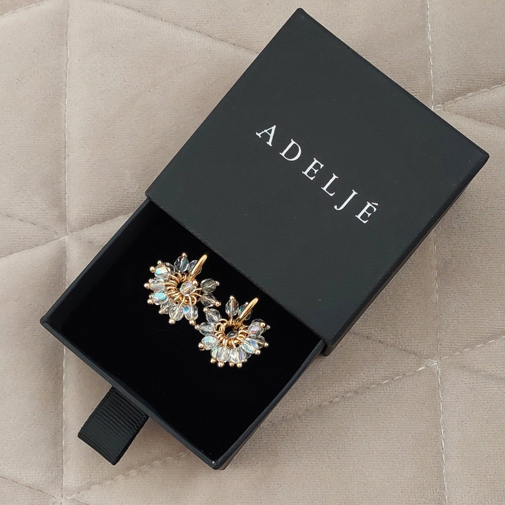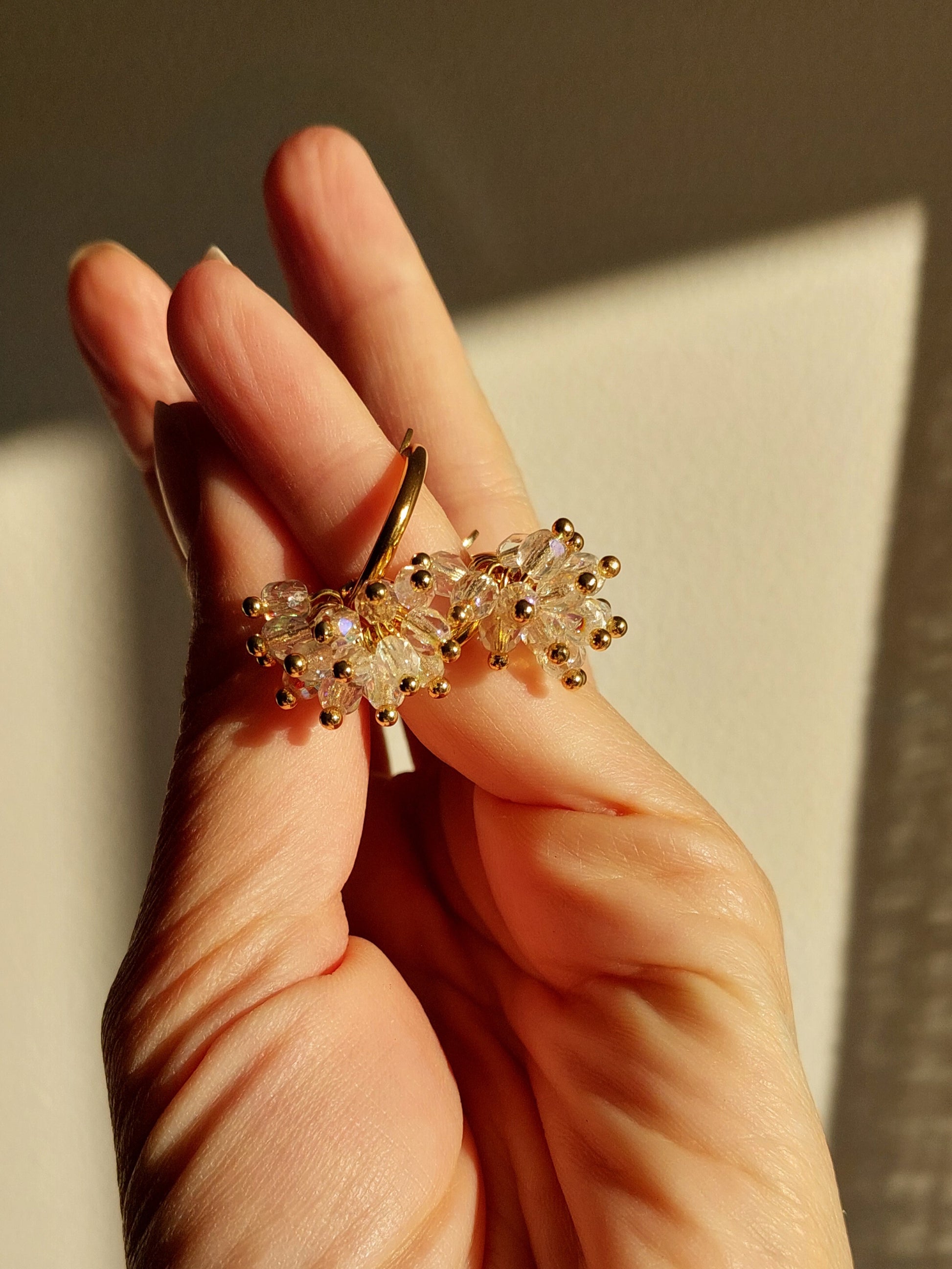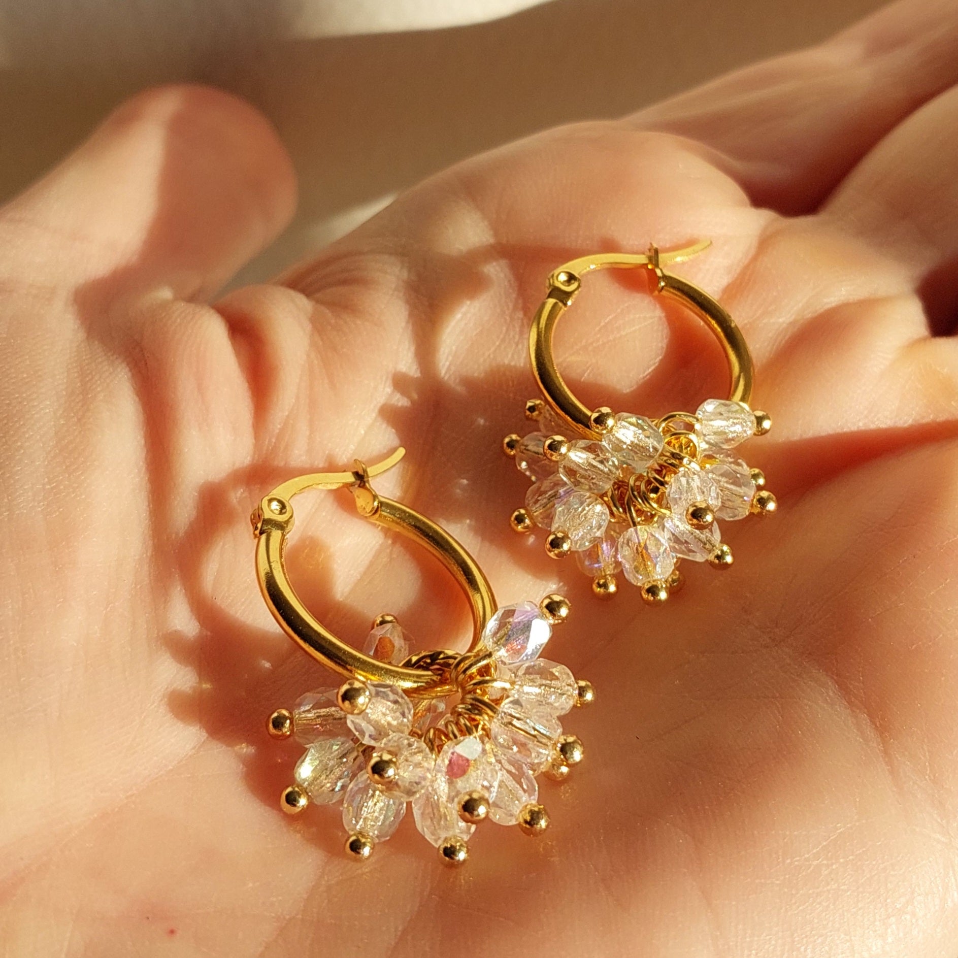 Lasihelmet ja ruostumattomasta teräksestä valmistetut, kullatut koruosat luovat ajattoman kokonaisuuden.