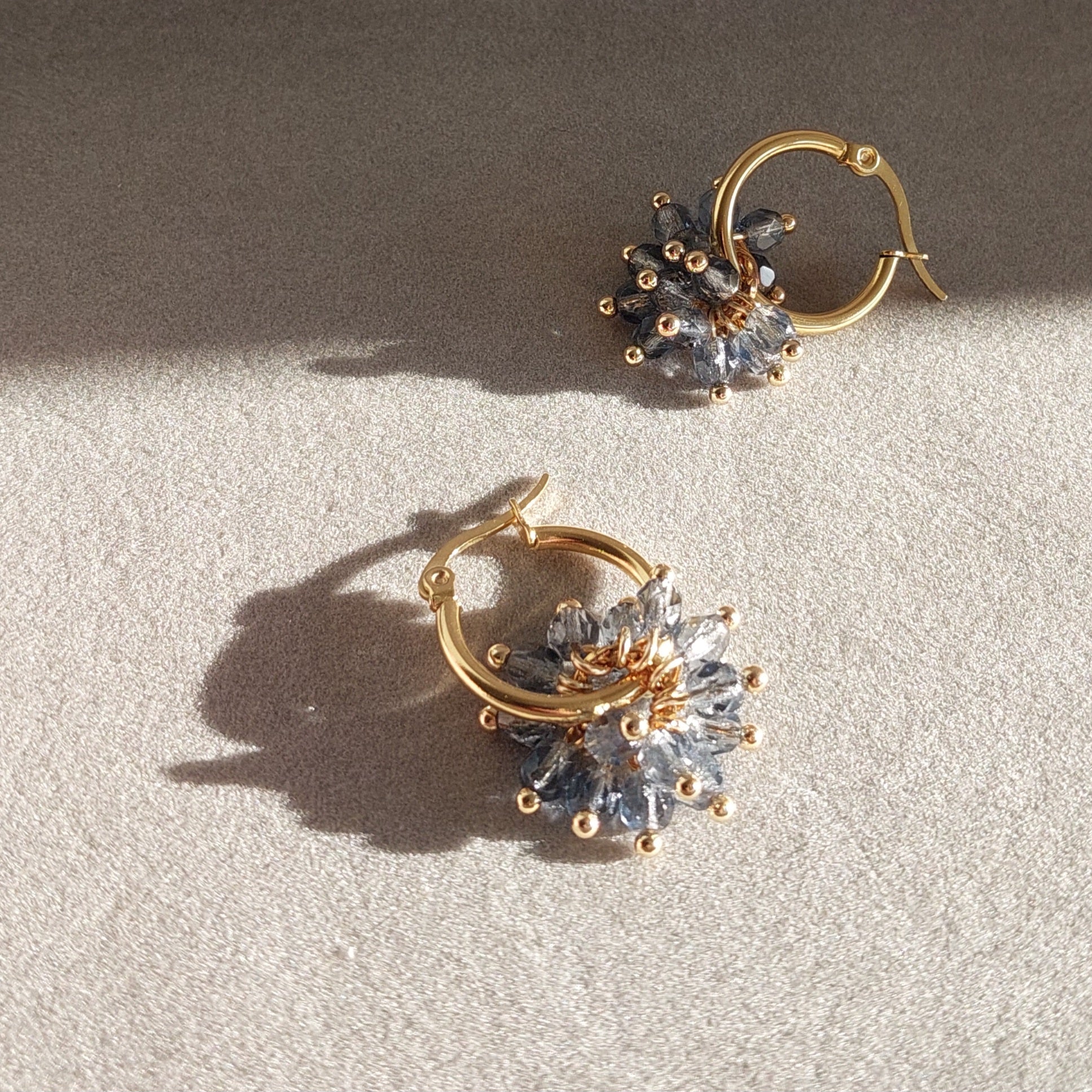Lasihelmet ja ruostumattomasta teräksestä valmistetut, kullatut koruosat luovat ajattoman kokonaisuuden.
