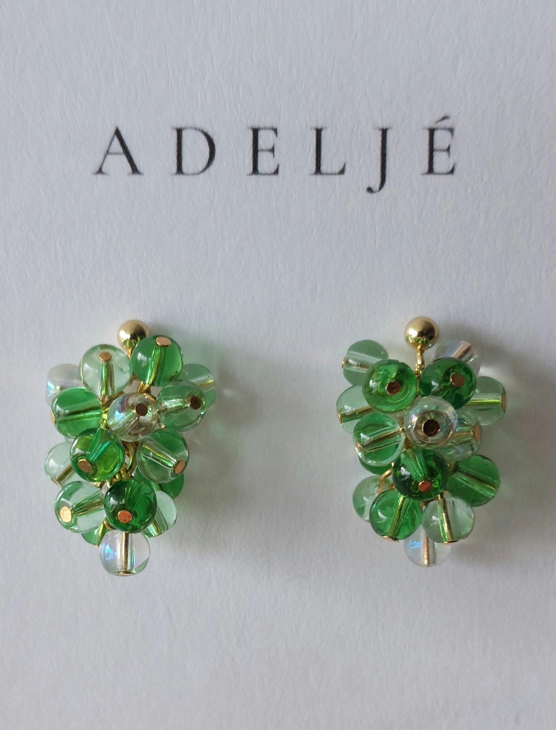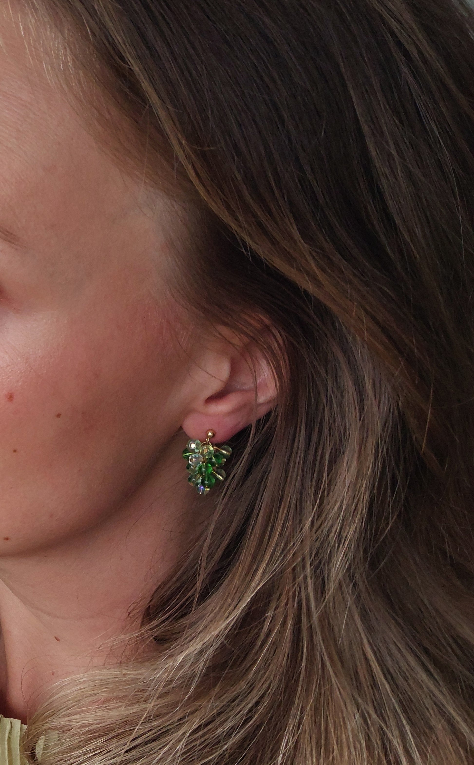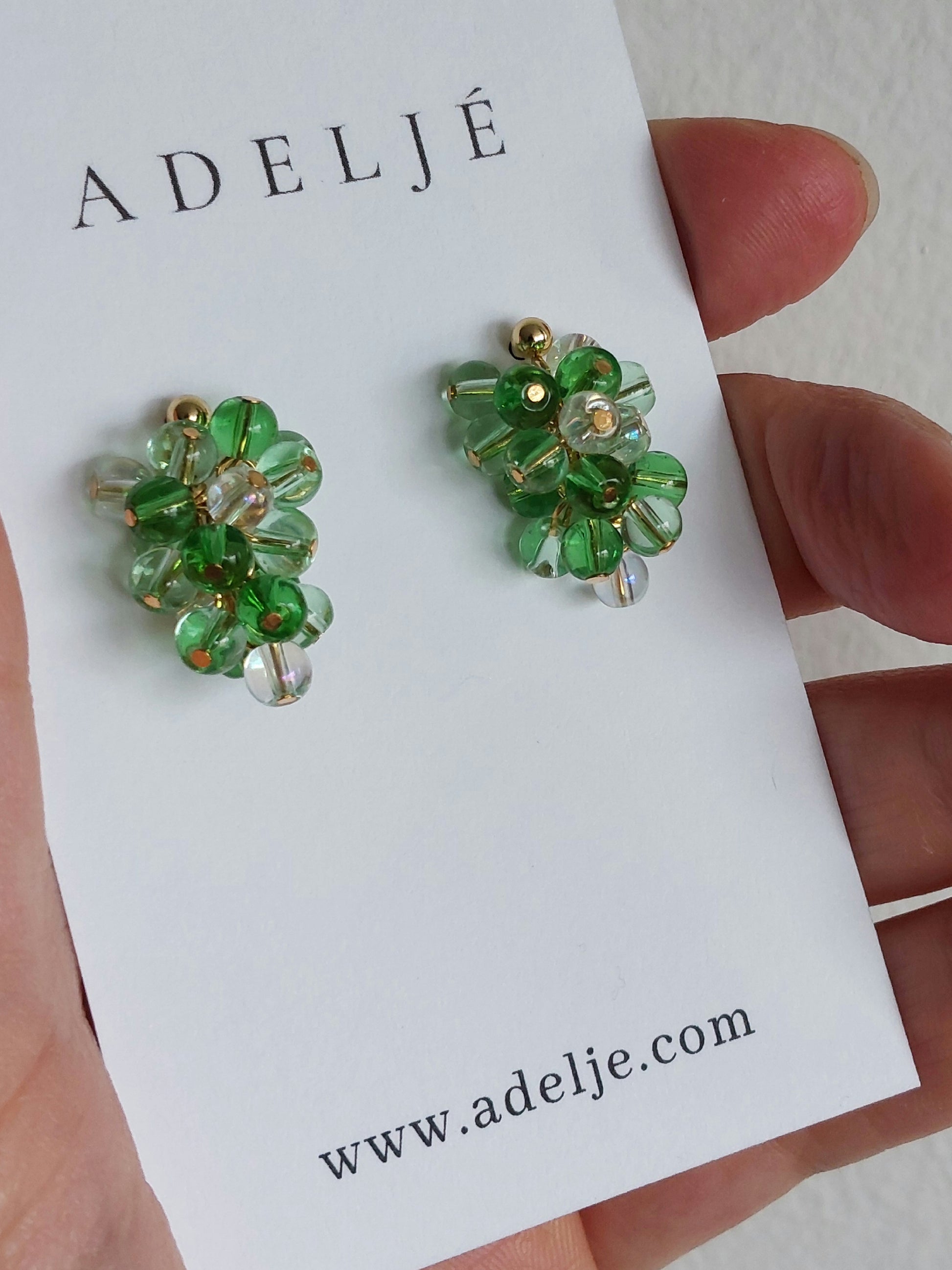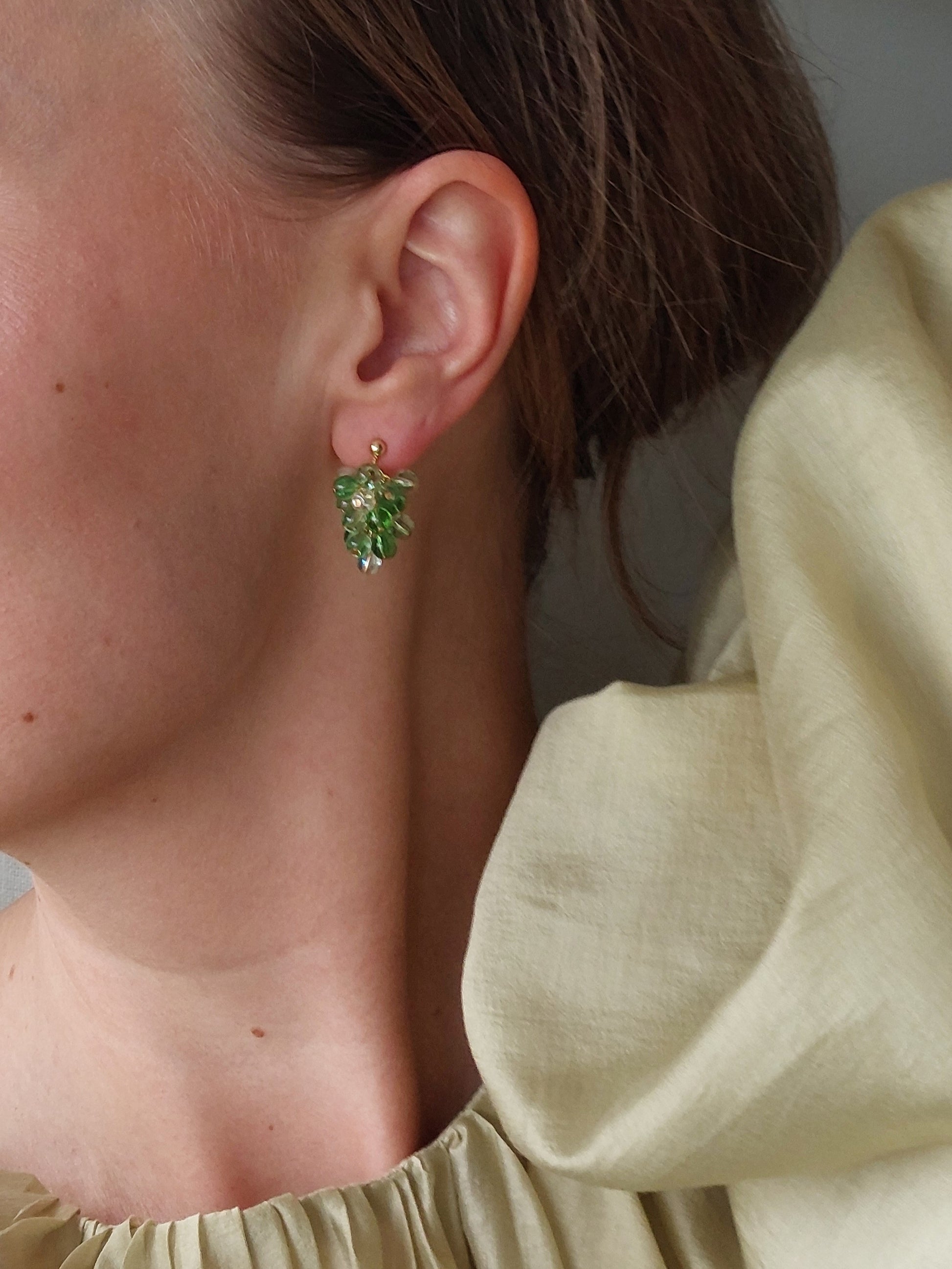 Näissä korvakoruissa säihkyy heleys ja raikkaus. Kullattuun tappikiinnitykseen on koottu pieniä, kevyesti hohtavia lasihelmiä, jotka taittavat valoa kauniisti jokaisella liikkeellä. Värimaailma loistaa kauniissa vihreässä ja raikkaan läpikuultavassa – tehden korvakoruista täydellisen valinnan niin arjen piristykseksi kuin juhlahetkiin.